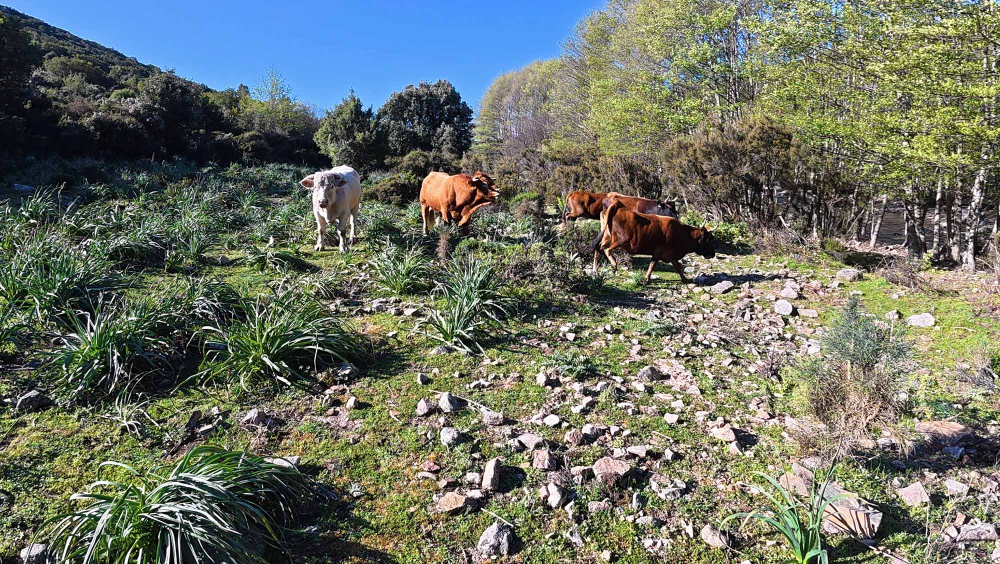 Scopriamo così il piccolo Rifugio Pitzu e X’Ilixi. Un bivacco molto ben tenuto con una vista maestosa sulle valle sottostante, oggi inondata da un sole risoluto a farne brillare il verde primaverile. Fosse sera, ci installeremmo senza pensarci, ma è solo ora di pranzo. Ne approfittiamo allora per rifocillarci al riparo dal vento insistente e per fare un po’ di manutenzione alla mia bici.