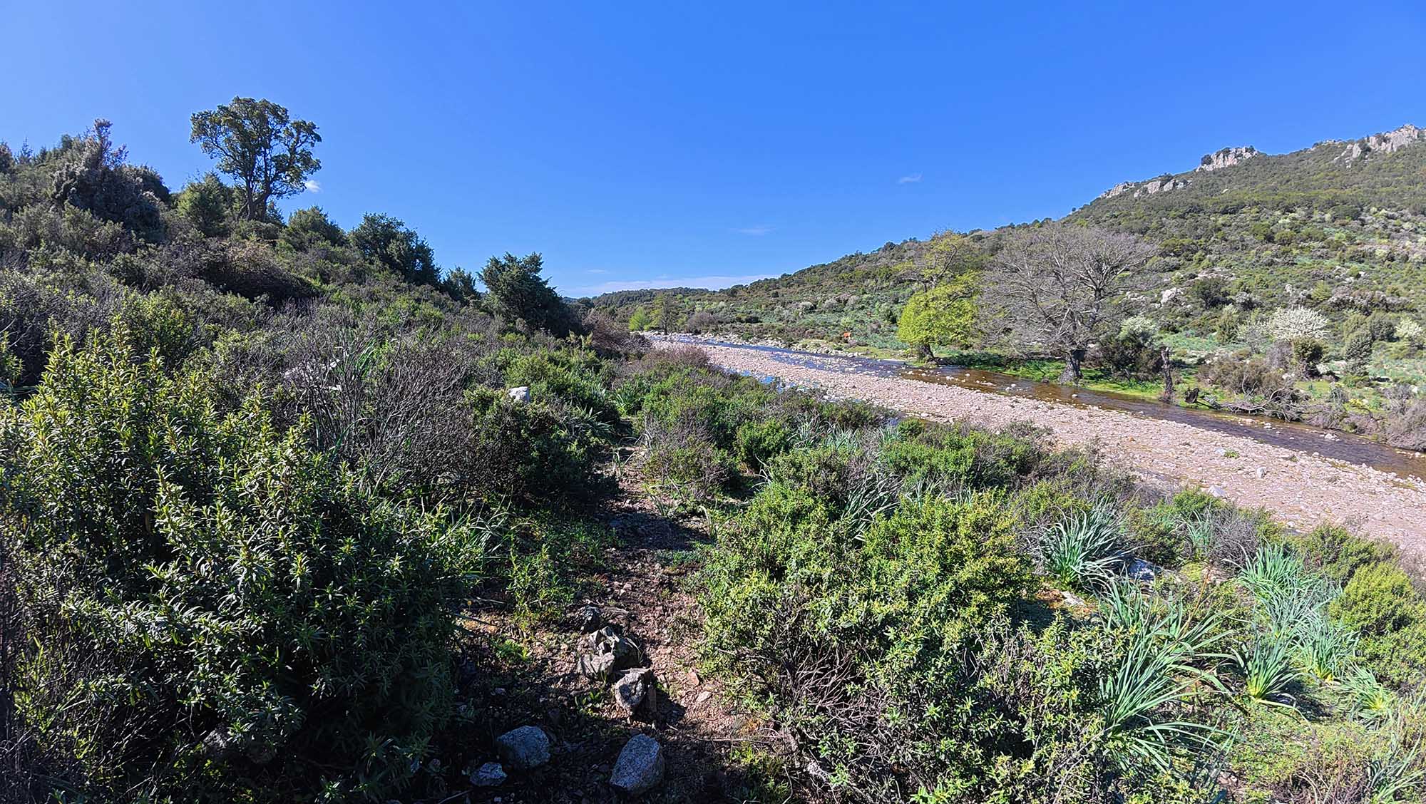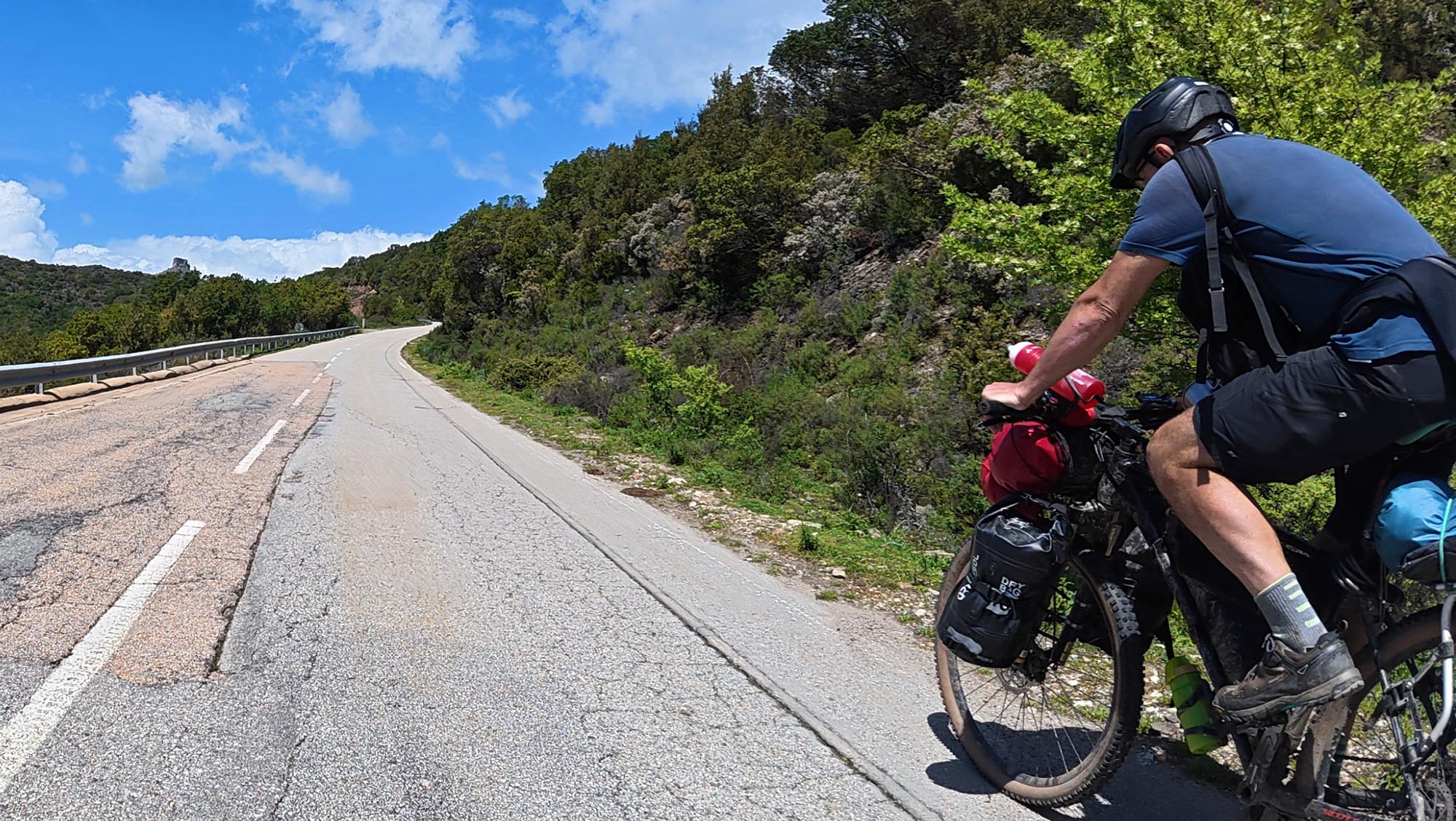 Già prima di parlarne esplicitamente, era chiaro che ci stiamo basando ogni giorno di più sul racconto portato da Giova per stimare quello che ancora ci attende e per misurare i nostri progressi. In più, ieri ho notato che il tracciato della Trasardinia integrato nella mappa OpenStreetMap sul mio GPS è diviso in segmenti. Ogni segmento inizia e finisce immancabilmente in corrispondenza delle località dove i ciclisti del racconto hanno pernottato. Ora, considerato che il racconto riporta il viaggio al 2005 e attribuisce a tale Giorgio il ruolo di guida, non è impensabile che sia proprio questi ad aver dato vita al tracciato che, in differita di vent’anni, stiamo cercando di ricalcare. Mi piace pensare che sia così.