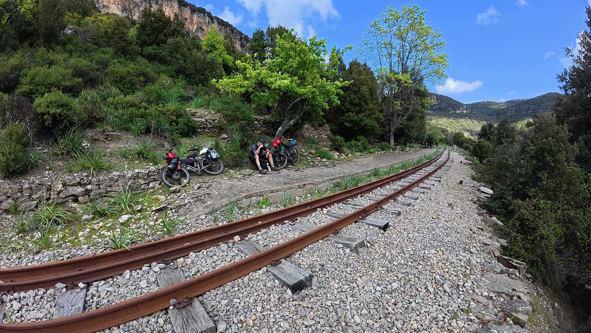 Usciti da un breve single-track, ci troviamo ad attraversare un ponte ferroviario, oltre il quale proseguono solo i binari. Non c’è nulla di serenamente percorribile, salvo ad avere un treno. La ferrovia è chiaramente in disuso e non c’è pericolo, ma è comuque notevole come ci siamo abituatuati all’imprevedibilità del percorso. Non siamo per nulla sorpresi e sperimentiamo subito vari approcci all’insolito terreno. A un tratto mi giro e scopro che Giova ha rinunciato a spingere la bici, è risalito in sella all’interno dei binari e procede sobbalzando al ritmo cadenzato delle traverse. Scoppio a ridere, ma poi non rinuncio a cimentarmi a mia volta.