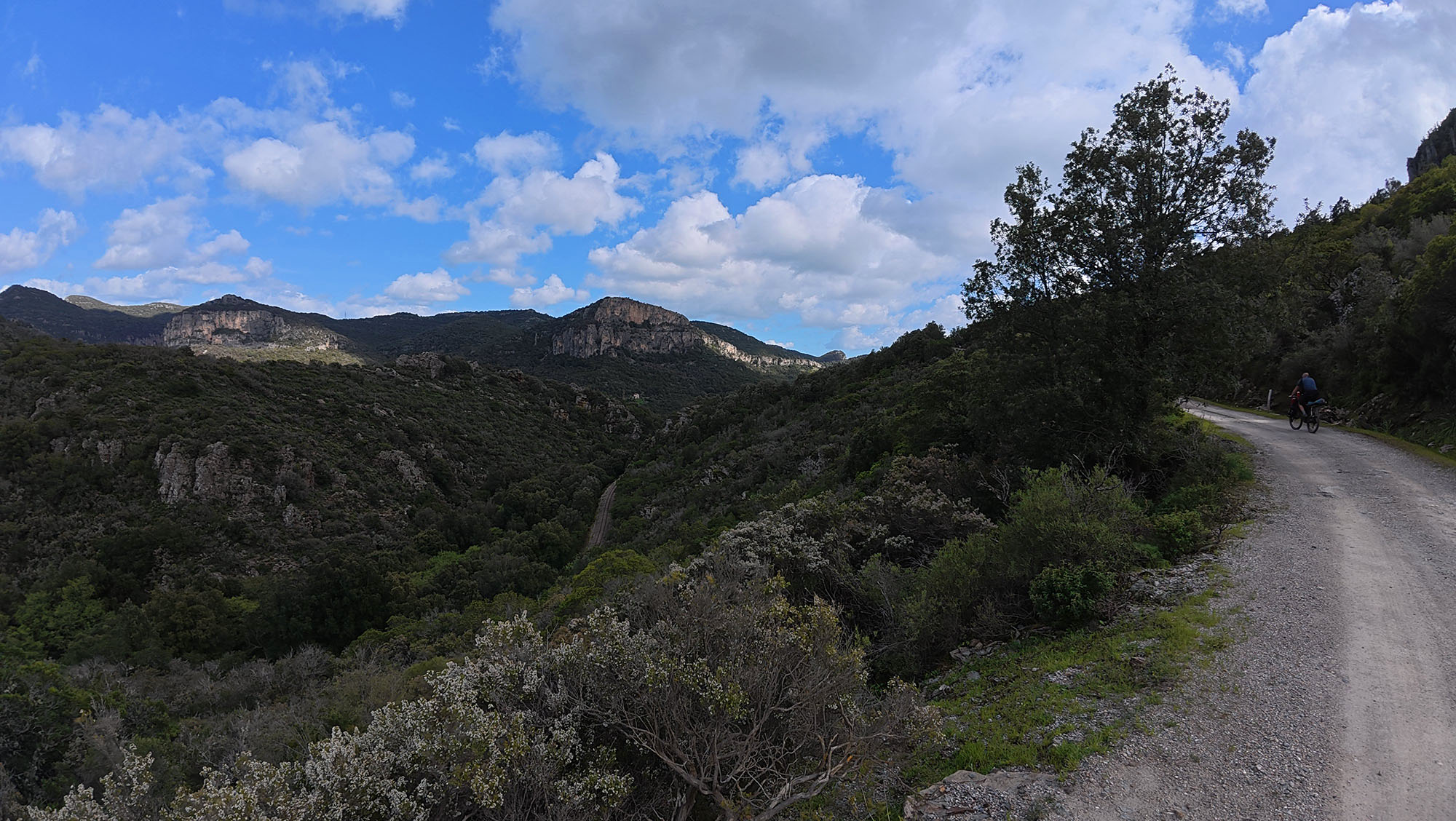 Dopo il rallentamento di ieri e stamattina nella valle del Bau, e afferrata la talentuosa capacità della Transardinia di offristi tanto come strada quanto come distesa omogenea di sassi e arbusti, abbiamo deciso di evitare per un poco tutte le varianti del percorso in fuori strada e ridurre la distanza che ci separa da Cagliari. Questo ha implicato abbandonare i nostri compagni di viaggio letterari: i ciclisti dei fogli stampati e sempre più mal conci di Giova. Loro, i Monti del Gennargentu li scavalcarono, noi invece li stiamo schivando. E un po’ ci dispiace. Per non riununciare proprio del tutto, consteggeremo il Gennargentu giusto all’interno del suo perimetro meridionale, sulla traccia di una variante della Transardinia sul mio GPS. La destinazione è Seui, dove loro alloggiarono. Riprenderemo ad accompagnarli da lì.