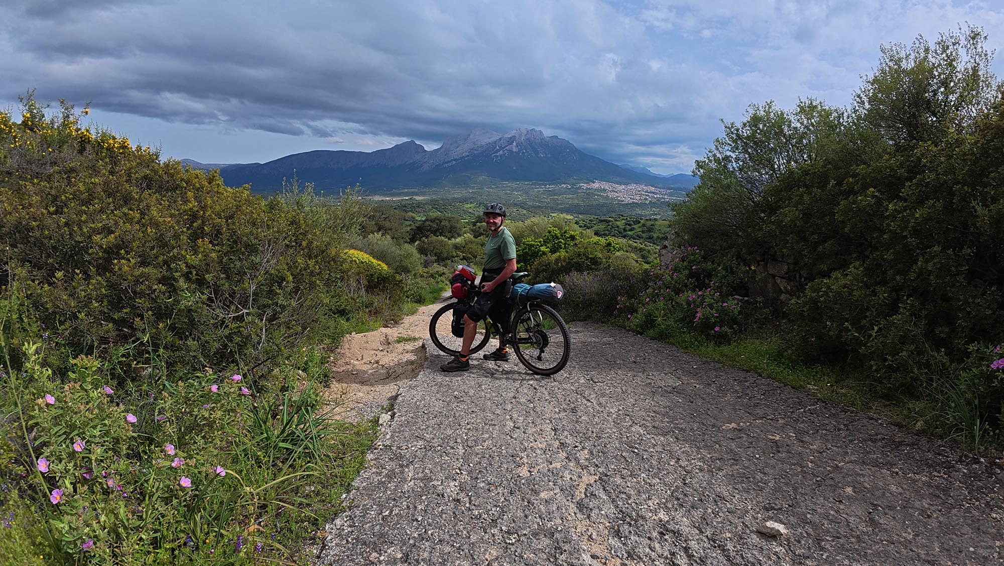 La discesa dal passo sulla provinciale 51bis, giusto alle pendici est di Nuoro, è particolarmente suggestiva: scorriamo veloci tra il viola e giallo intenso dei fiori mentre il Supramonte di Oliena si staglia troneggiante di fronte a noi.