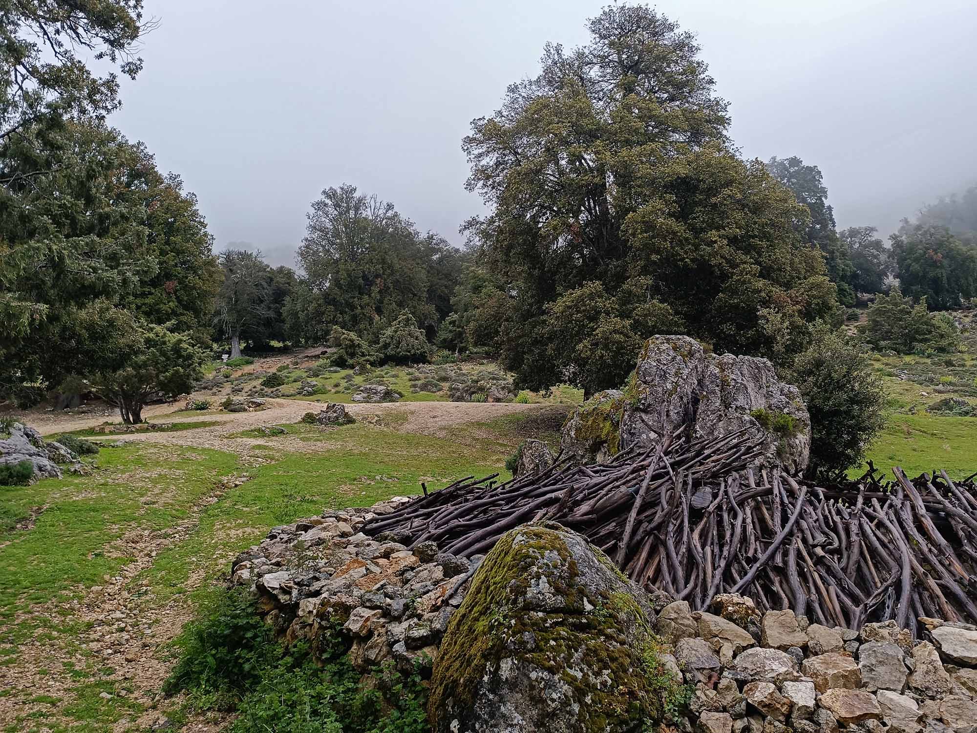 Iniziamo il tratto che dovrebbe portarci a misurare una buona lunghezza del Supramonte in quota fino al passo di Scala S’Arenargiu, prima di ridiscendere a valle. I fogli stampati di Giova descrivono il percorso come uno dei più difficoltosi dell’intera traversata della Sardegna, in cui i sassi e la pendenza delle rampe richiedono spesso di spingere la bici. Il racconto si rivela rapidamente accurato e per un’oretta insistiamo a trascinare, sballottare e graffiare il nostro umore su un sentiero stretto e cosparso di grossi sassi sciolti. Con delle bi-ammortizzate e senza i nostri 50 litri a testa di bagaglio sarebbe divertente.