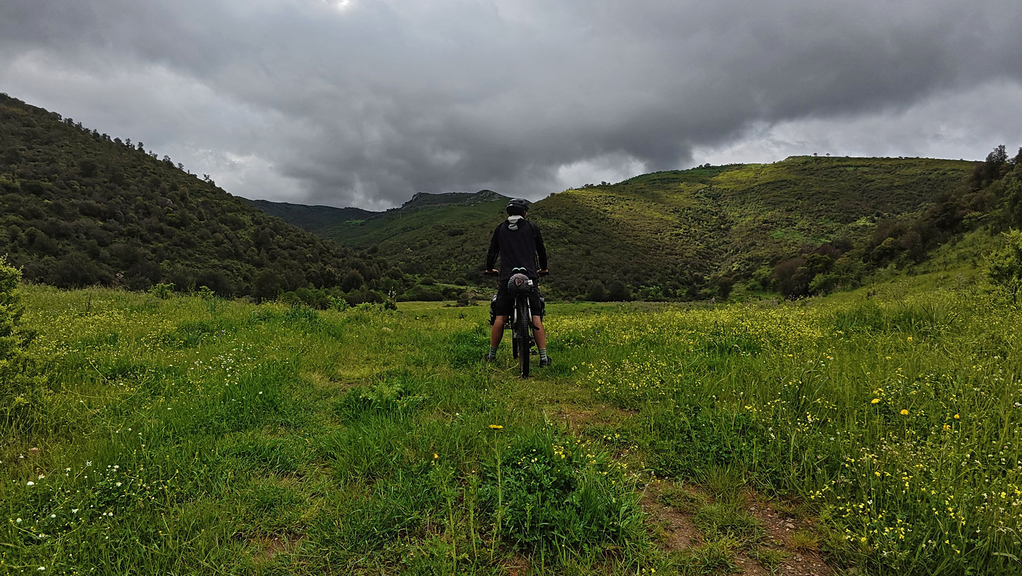 Saliamo nel dolce canolone che chiude la valle e il calore che produciamo ci tiene asciutti. La carrareccia di terra battuta è a più riprese erosa su entrambi i lati da squarci torrentizzi nel suolo, profondi anche un paio di metri. A tratti il residuo di percorso si stringe in istmo largo appena a sufficienza per una bici. “Sarà percorribile fino in cima sto sentiero?”