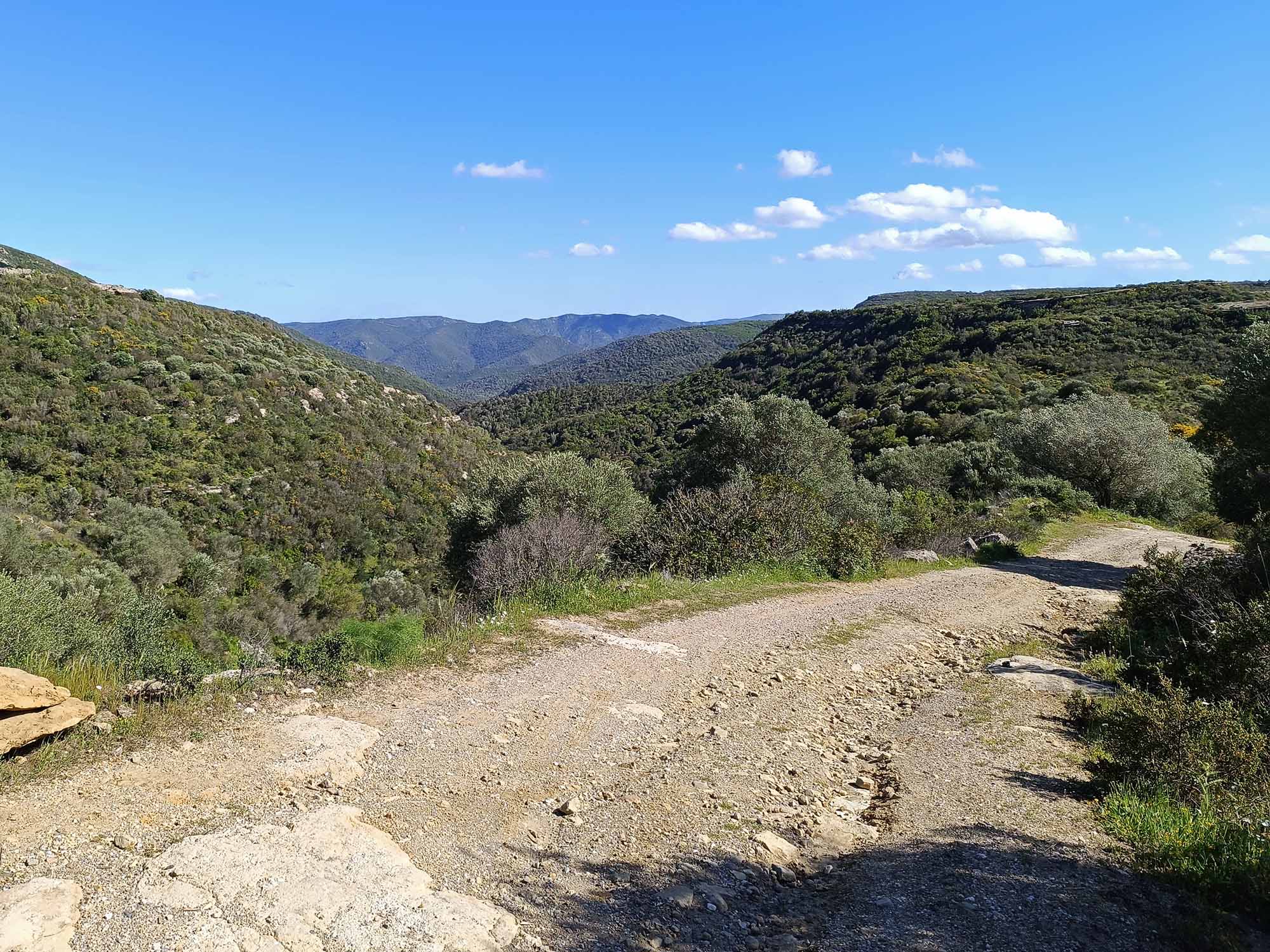Ci installiamo su una panchina in cemento e mettiamo mano al materiale topografico. La Transardiania ci condurrebbe di nuovo a sentieri, verso Armungia, in un saliscendi su dislivelli piuttosto contenuti, ma con pendenze importanti e l’incognita di quanto impervio possa farsi il terreno. Il rischio di ritrovarci ad affrontare un tratto come quello delle valle del Bau – con in più la pressione di doverci sbrigare per arrivare a Cagliari – non ci attrae per nulla.